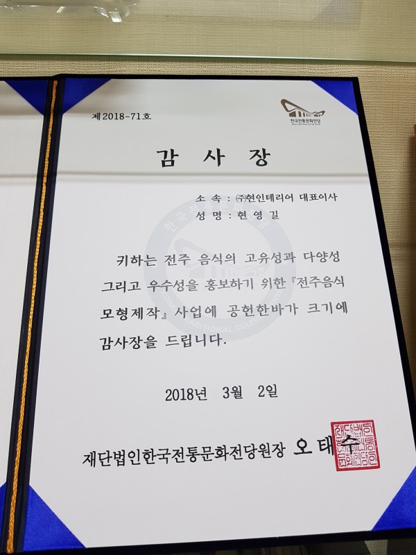작년부터 진행해오던 전주 음식모형 전시사업으로 한국전통문화재단으로부터 감사장을 받게되었습니다.